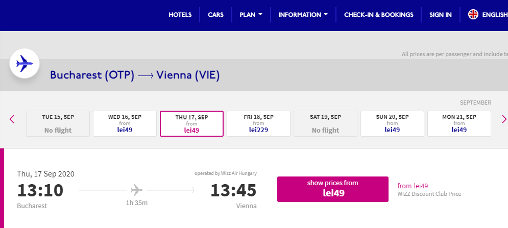 Un drum, Bucuresti – Viena, fara bagaj si alte servicii extra costa 49 lei si returul la fel, pe anumite date.
